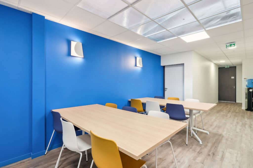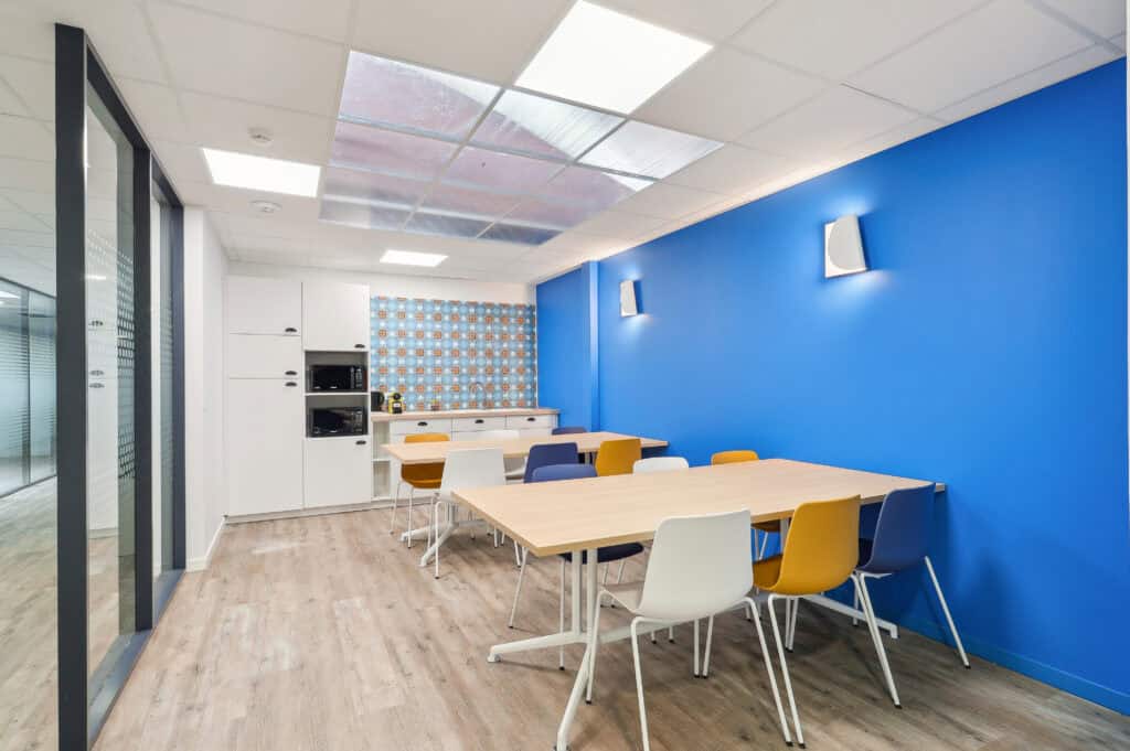 Pour dynamiser l’ensemble du plateau, un espace convivialité a été conçu avec des couleurs plus vives et du mobilier coloré pour contraster avec le reste des espaces. On retrouve entres autres une table et des chaises colorées pour ajouter un peu de pep’s aux espaces et offrir une zone totalement dédiée pour boire son café comme il se doit !