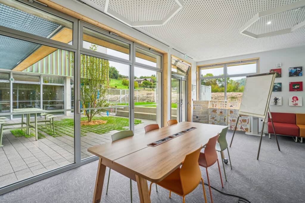 La mairie de Grésy-sur-Aix voulait créer un tiers-lieu ouvert à tous : reloger la médiathèque dans un espace plus grand, accueillir les associations culturelles, développer des salles d’activités, un pôle image, des studios musique et un patio extérieur. Un projet pensé pour devenir un lieu de vie, polyvalent et intergénérationnel.