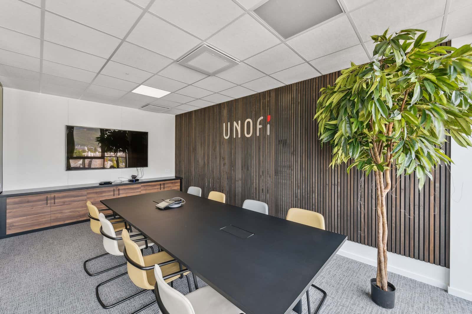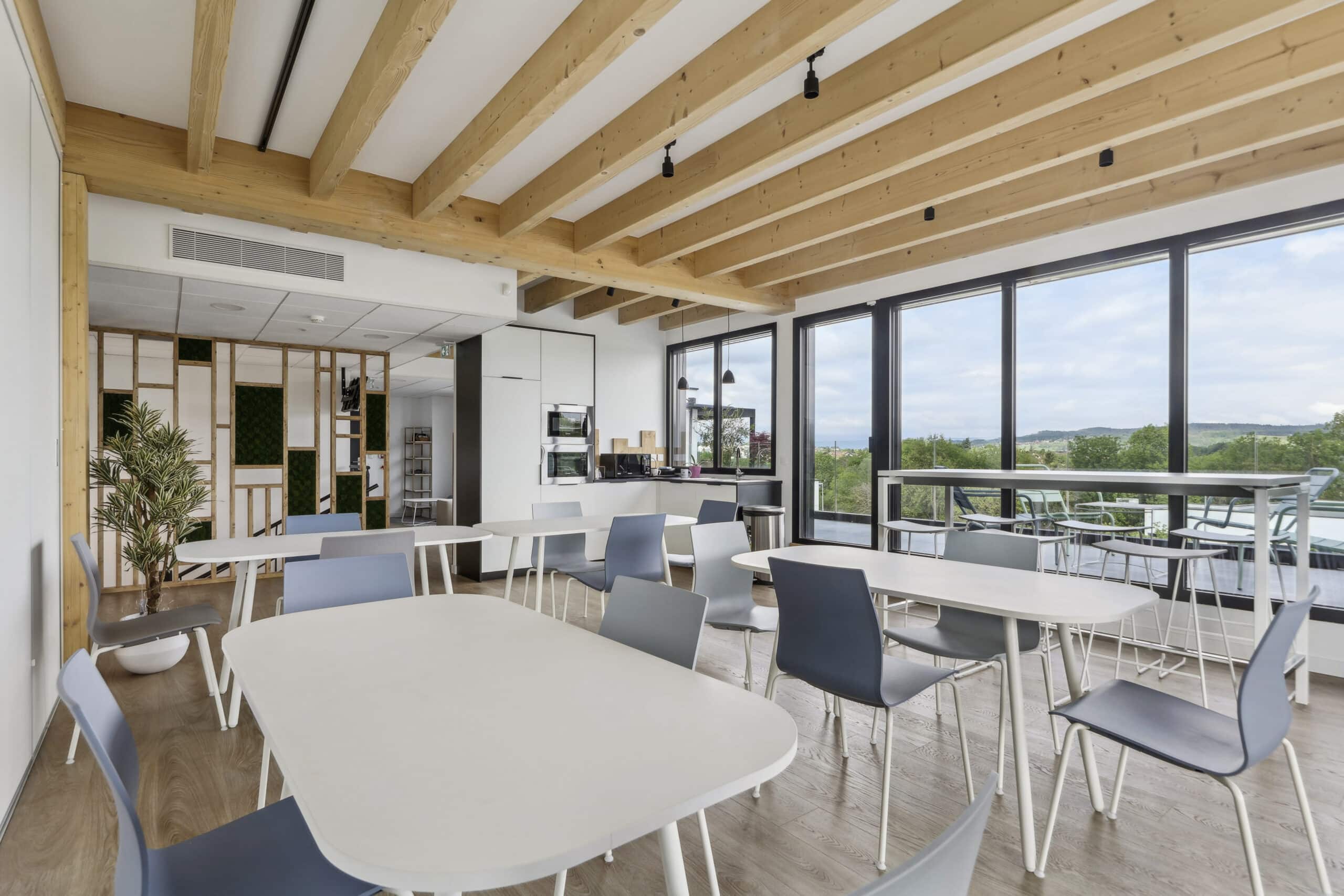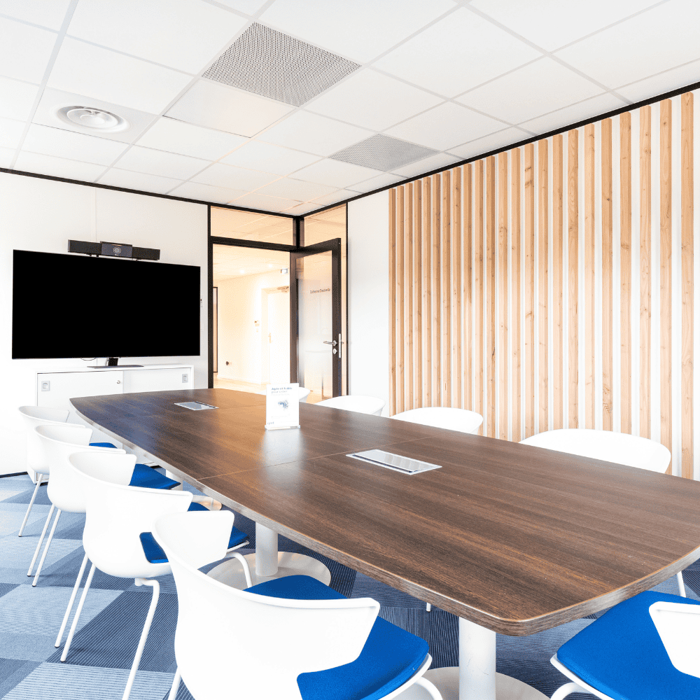 Pour leurs espaces bureaux, nous leur avons proposés un mobilier fonctionnel, incluant une grande table de restauration pour que le personnel puisse se retrouver le midi, des hauteurs de mobilier variées selon les salles de réunion (avec des options standup pour les réunions rapides) et la récupération de leur grande table de réunion existante.